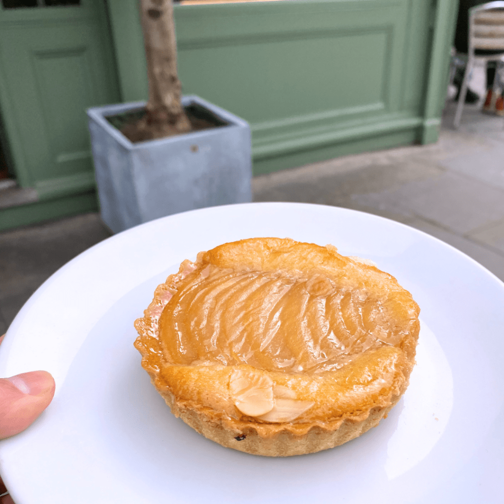 This week I had this delicious pear and almond tart from Greensmiths. It was sweet and nutty but not sickly and I believe it had cinnamon in it as well because it tasted a little spiced. Firm on the bottom, soft inside, and what made it even better is that I ate it while wearing my good pants — what a day!